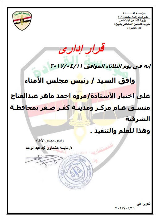 ولقد حصلت Marwa Maher على تقدير رسمي يعكس حجم تأثيرها وثقة الجهات المؤسسية في خبرتها، حيث تم اختيارها بقرار إداري منسقًا عامًا لمركز ومدينة كفر صقر بمحافظة الشرقية، في خطوة تؤكد دورها القيادي الفعّال في دعم وتطوير المبادرات الاقتصادية والمجتمعية.